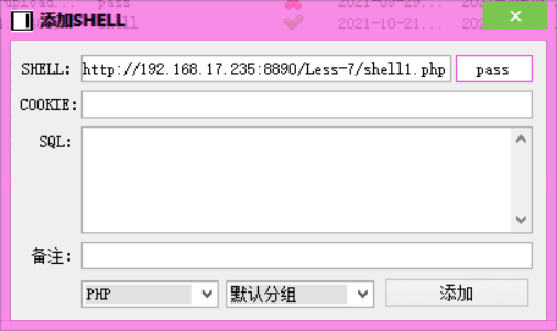 然后我们通过菜刀连接上面的shell1.php密码是pass