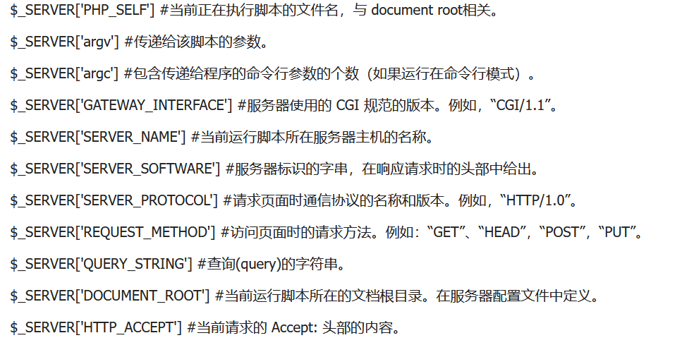 $_SERVER 是一个包含了诸如头信息(header)、路径(path)、以及脚本位置(script locations)等等信息的数组。