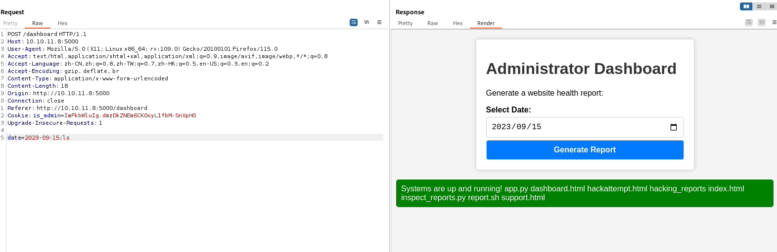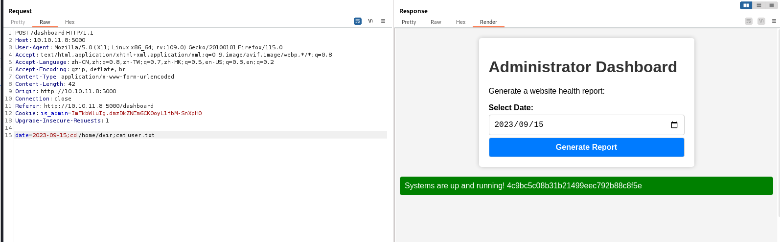 利用 管理员cookie访问/dashboard页面,页面提示根据日期生成网站运行状况,点击生成后提示系统已启动并运行。
