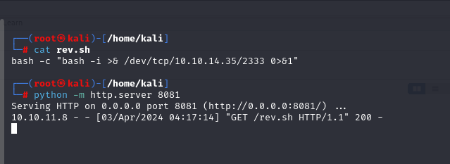 在本地新建一个rev.sh脚本,在脚本内添加反弹shell语句,通过curl下载到靶机并运行