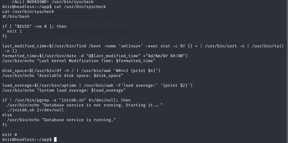 同样在本地新建一个initdb.sh脚本,在脚本中添加反弹shell,使用sudo /usr/bin/syscheck来调用这个脚本,成功提权到root