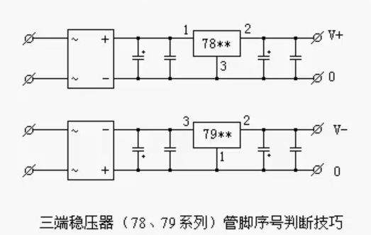 用78/79系列三端稳压IC来组成稳压电源所需的外围元件极少,电路内部还有过流过热及调整管的保护电路,使用起来可靠、方便,而且价格便宜。该系列集成稳压IC型号中的78或79后面的数字代表该三端集成稳压电路的输出电氏,如7806表示奇出电压为正6v。7909表示输出电压为负9V。