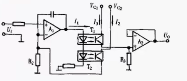利用2个具有相同非线性传输特性的光电耦合器,T1和T2,以及2个射极跟随器A1和A2组成,如下图所示。