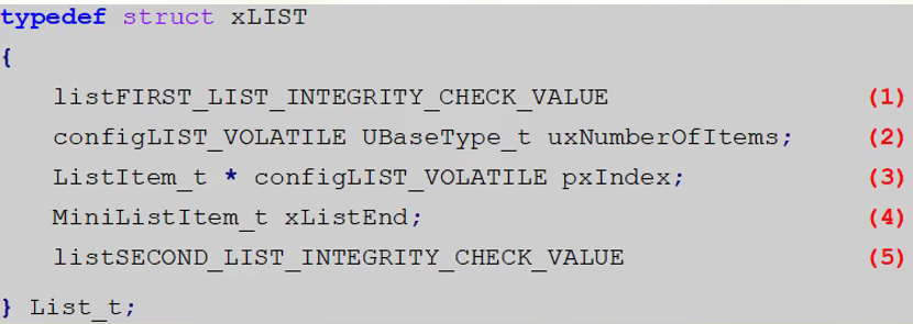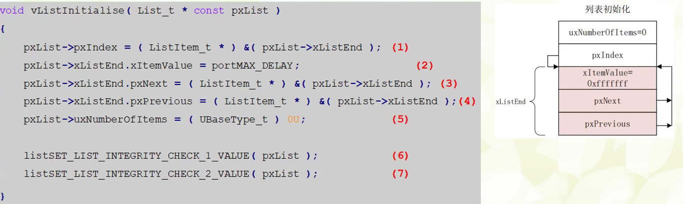 - (3)、(4)、(5)列表项xListEnd的pxNext和pxPrevious指针指向了它自己,空列表