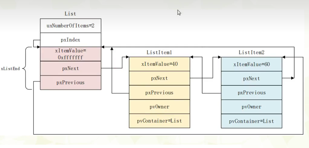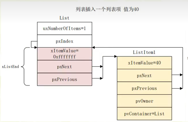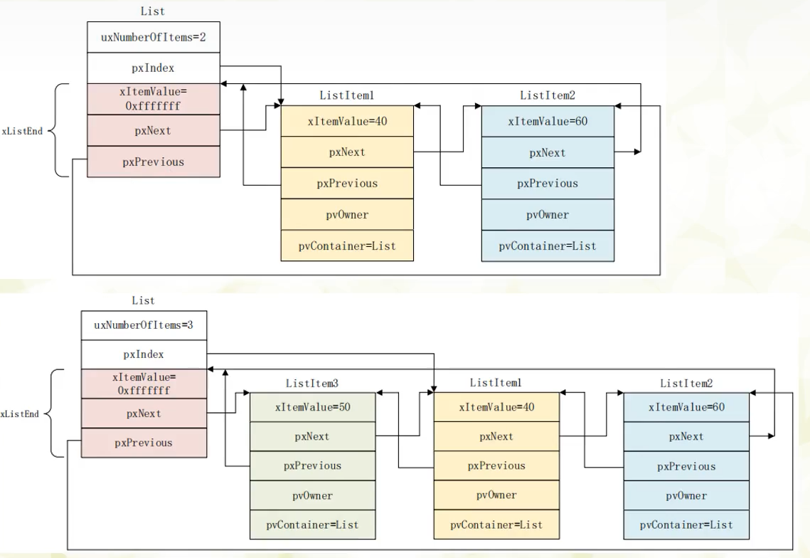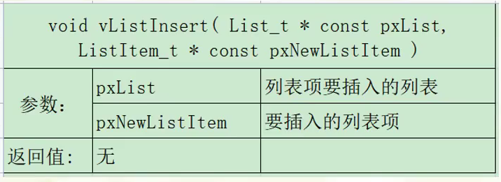 1 void vListInsert( List_t * const pxList, ListItem_t * const pxNewListItem ) 2 { 3 ListItem_t pxIterator; // 新建临时列表项,用于遍历列表 4 const TickType_t xValueOfInsertion = pxNewListItem->xItemValue; // 获取要插入列表项的值 5 if ( xValueOfInsertion == portMAX_DELAY ) // 要插入列表项项值判断位置,是否在列表最后 6 { 7 pxIterator = pxList->xListEnd.pxPrevious; // 将列表最后的前一个值改变 8 } 9 else 10 { 11 for ( pxIterator = ( ListItem_t * ) &( pxList->xListEnd );// 索引从链表最后开始往前索引 12 pxIterator->pxNext->xItemValue <= xValueOfInsertion;// 通过next索引,与要插入列表项值比较 13 pxIterator = pxIterator->pxNext ) // 移动next指针进行索引 14 { 15 16 } 17 } 18 pxNewListItem->pxNext = pxIterator->pxNext; // 改变要插入列表项的 next 指针 19 pxNewListItem->pxNext->pxPrevious = pxNewListItem; // 改变要插入列表项的 prev 指针 20 pxNewListItem->pxPrevious = pxIterator; 21 pxIterator->pxNext = pxNewListItem; 22 23 pxNewListItem->pvContainer = ( void * ) pxList; // 通过pvContainer标记列表项属于哪个列表 24 ( pxList->uxNumberOfItems )++; // 列表的列表项数目自增 25 }