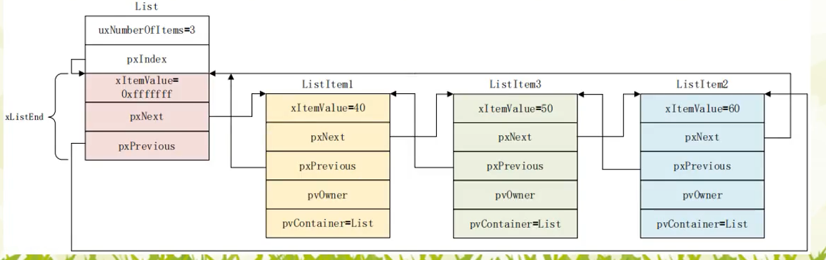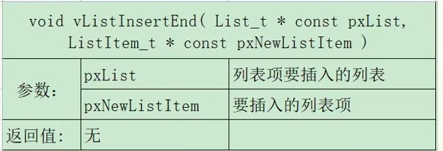 1 void vListInsertEnd( List_t * const pxList, ListItem_t * const pxNewListItem ) 2 { 3 ListItem_t* const pxIndex = pxList->pxIndex; 4 5 /*检查列表和列表项数据的完整性,仅当configASSERT()定义时有效。*/ 6 listTEST_LIST_INTEGRITY( pxList ); 7 listTEST_LIST_ITEM_INTEGRITY(pxNewListItem ); 8 9 /*向列表中插入新的列表项*/ 10 pxNewListItem->pxNext = pxIndex; 11 pxNewListItem->pxPrevious =pxIndex->pxPrevious; 12 13 mtCOVERAGE_TEST_DELAY(); 14 15 pxIndex->pxPrevious->pxNext =pxNewListItem; 16 pxIndex->pxPrevious = pxNewListItem; 17 18 pxNewListItem->pvContainer = ( void* ) pxList; 19 20 ( pxList->uxNumberOfItems )++; 21 }