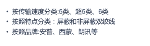 5类百兆、6类千兆。屏蔽双绞线电缆的外层由铝泊包裹,以减小辐射,但并不能完全消除辐射。屏蔽双绞线价格相对较高,安装时要比非屏蔽双绞线电缆困难。