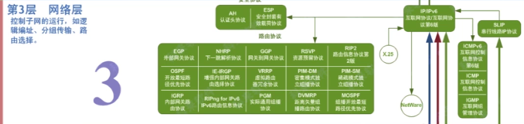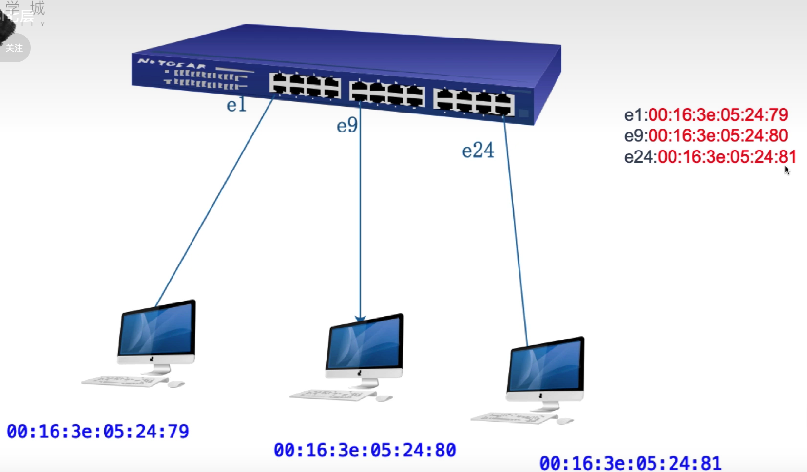 - 交换机:负责组建局域网,研究的是MAC地址(网卡地址,全球唯一,48位,前24厂商,后24位全球唯一编号)
