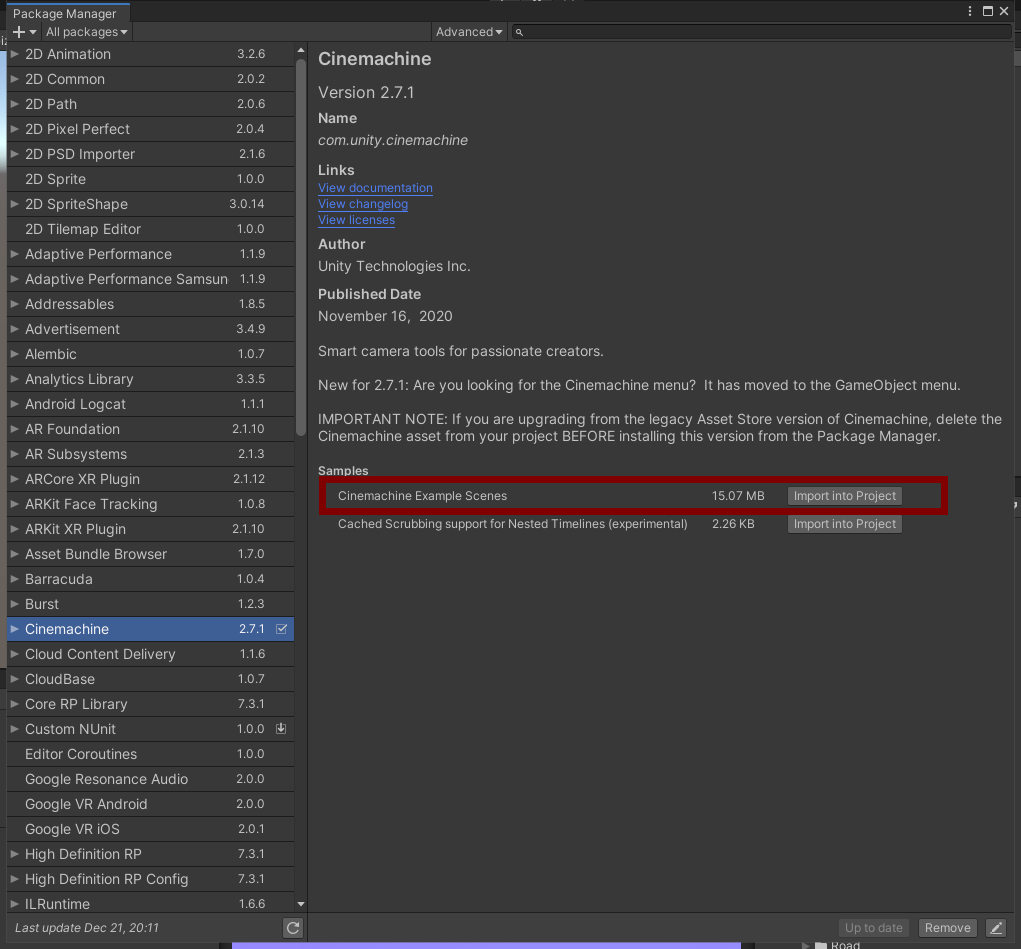 对了,安利一波,Cinemachine插件里的Example Scenes(在Package Manager里下载)可以查看官方人员怎么使用的。其中有个场景(Free Look character)写了个人物移动的功能,使用起来那是十分舒服,脚本也是十分简短,有兴趣的小伙伴去看看吧!