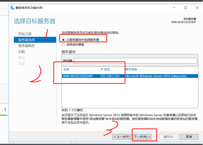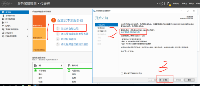 在服务器管理器中选择 1.添加角色和功能 2.启动删除角色和功能向导 3.下一步