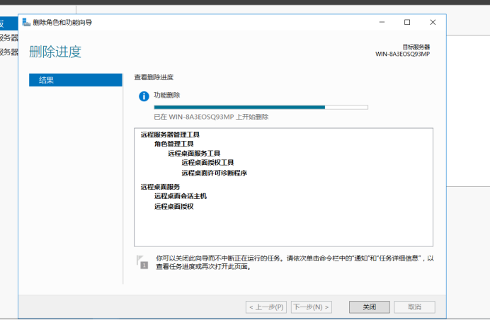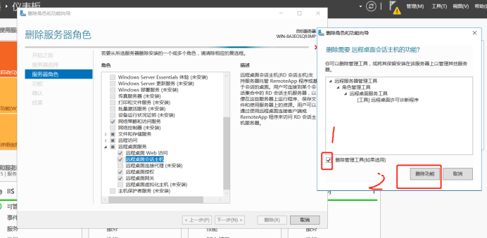 - 将“远程桌面会话主机”对号点掉,会弹出删除角色和功能向导,删除管理工具前点上对号,然后点击“删除功能”