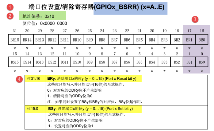 // BSRR = BRy[31:16](低电平输出控制) + BSy[15:0](高电平输出控制) BRy BSy 同时Enable时,只有BSy起作用,