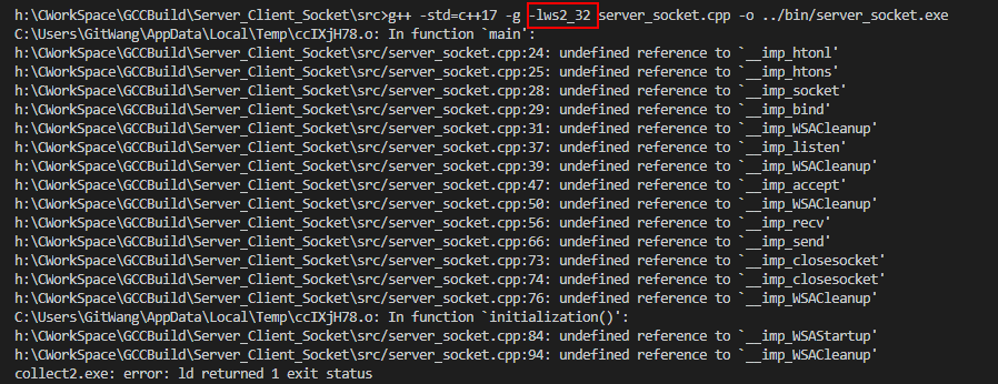 编译时调用动态库 -lws2_32 的位置可能会导致异常出现,这里最好将 -lws2_32 放在编译命令的最后面。