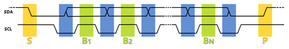 - 重复此过程,在SCL为低电平时SDA转换(整个蓝条时间),而在SCL为高电平(B2,... Bn)时读取数据。