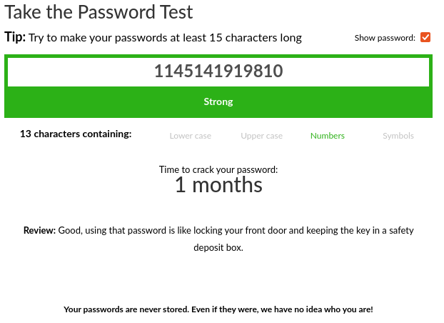 | \(10\) | \(1\) | \(10\) | \(114514\) 天中的秒数 | \(\approx 9.89\times10^9\) | \(+\) |