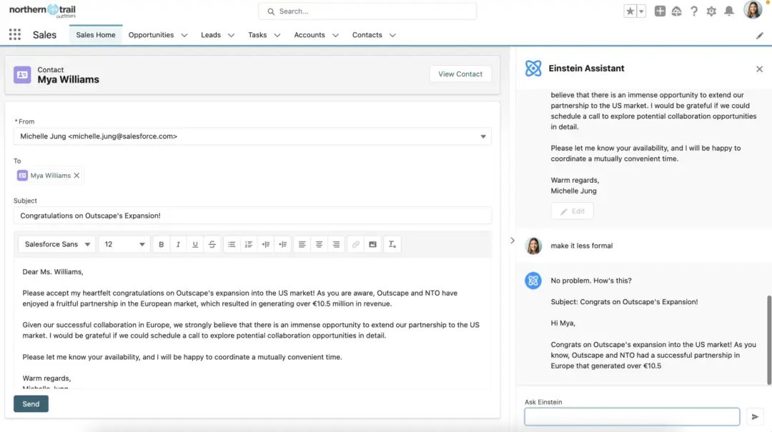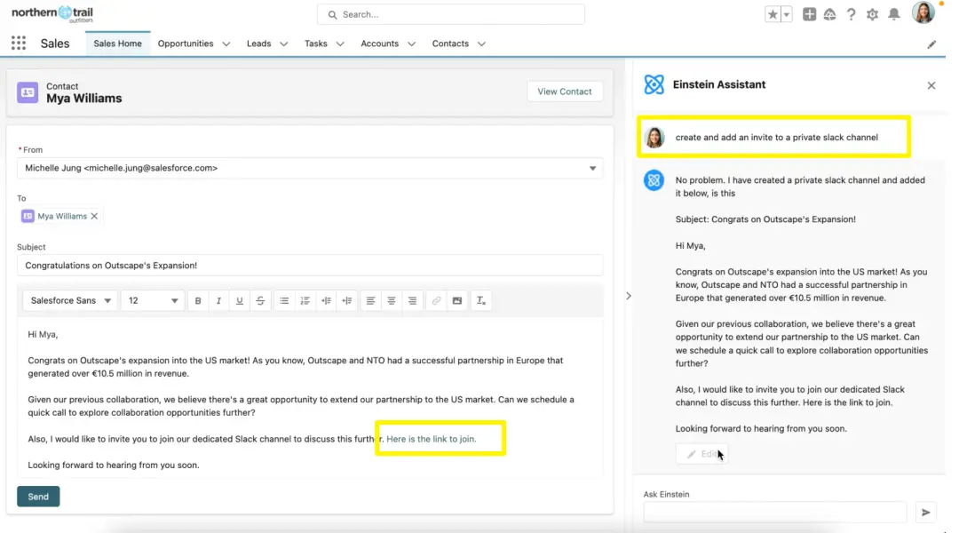 此外,销售代表可以通过Einstein生成一封电子邮件,GPT可以将邮件内容更个性化,口语化。