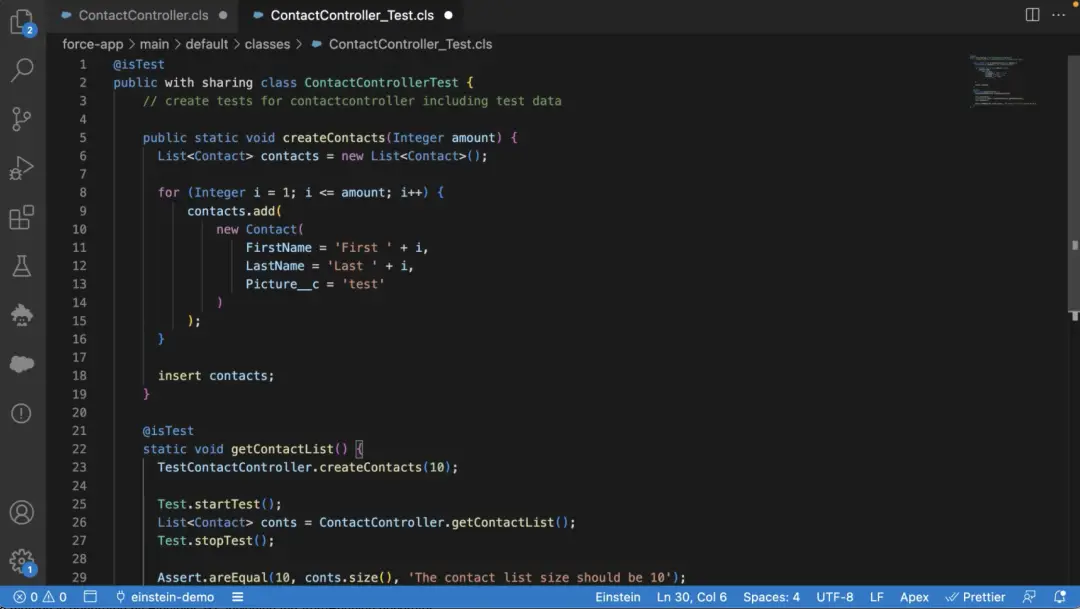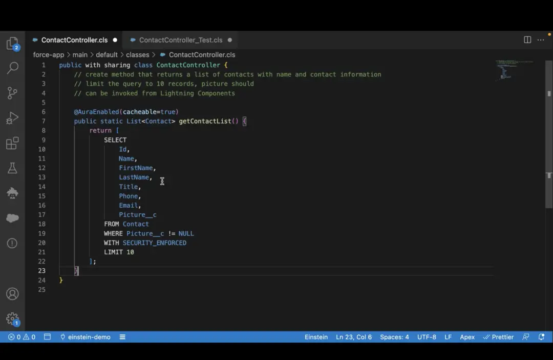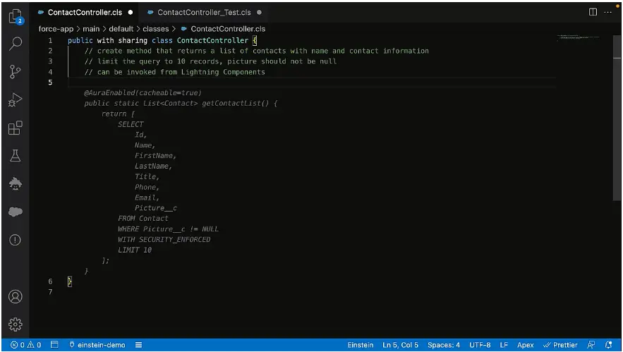 在Apex类(例如ContactController)中,开发人员可以指导Einstein写注释。