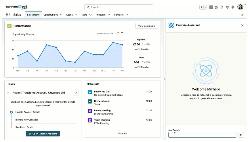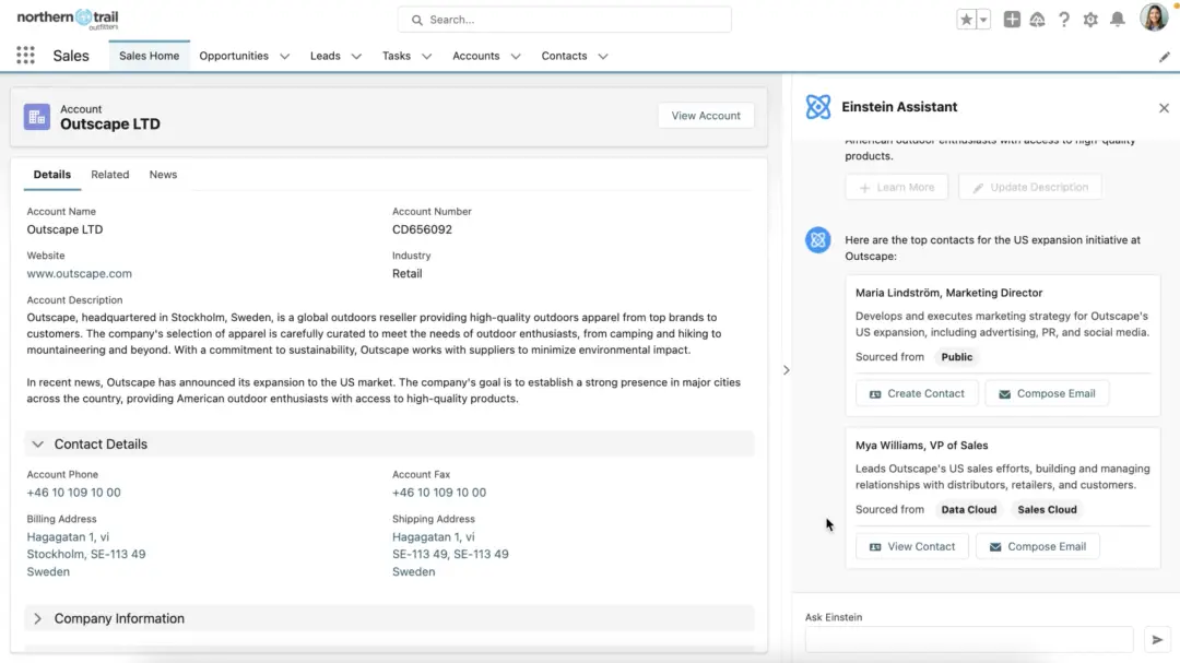 假设销售代表最近新增了一个潜在客户,Einstein Assistant可以协助销售工作,例如完善公司简介,提供公司最近的新闻。Einstein通过CRM数据和外部数据的组合来生成响应,打开客户记录视图,并更新客户描述。