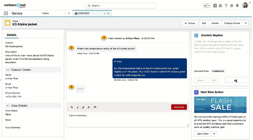 如上图所示,顾客向座席发送了一条消息,询问衣服可穿的适宜温度。Einstein Replies组件(由GPT提供支持)会根据顾客的问题,自动生成响应。座席只需要发送回复或编辑消息即可。