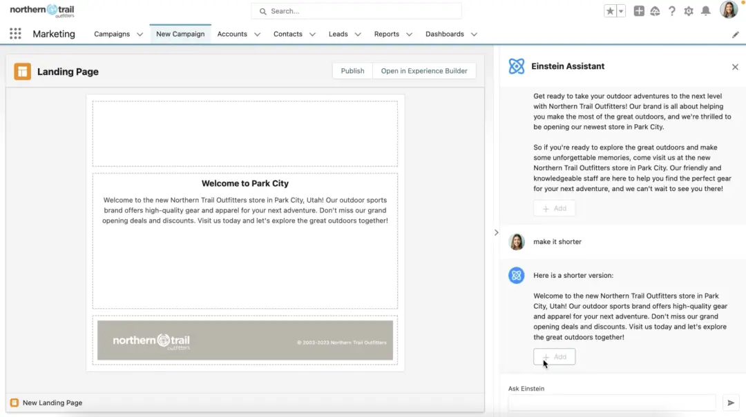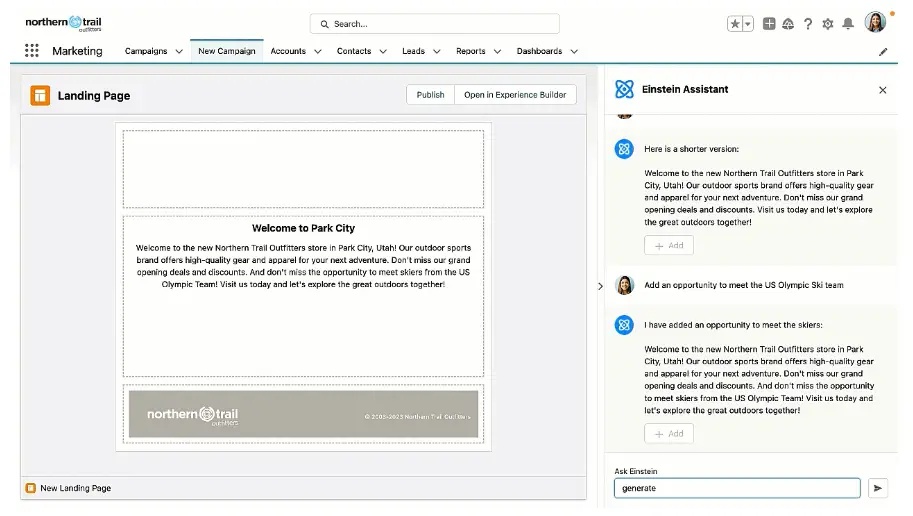 例如,营销经理需要为即将举行的活动创建登录页面,可以通过Einstein GPT创建登录页面模板和活动消息。