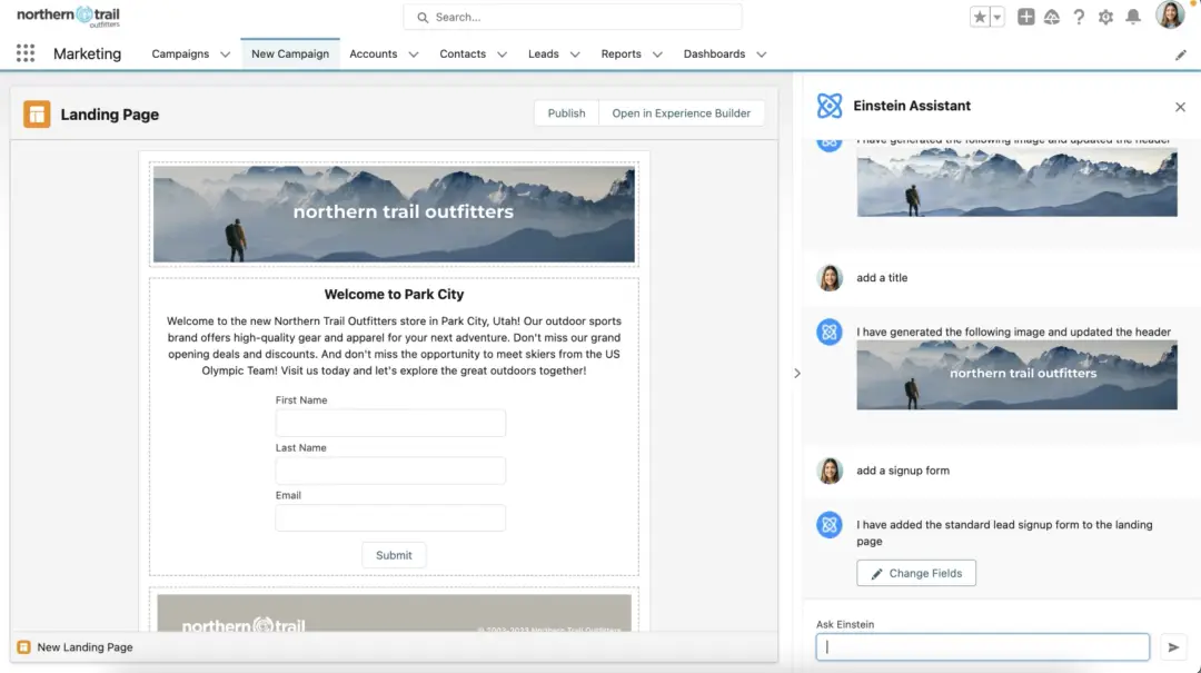 Einstein GPT甚至可以显示符合营销人员描述的图像、标题以及表单(包括修改表单字段的操作)。