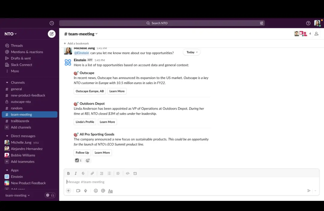 - 研究工具,即Slack中基于AI的客户洞察,例如销售机会的智能摘要和客户背景研究。