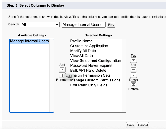 此外,还需要选择在列表视图中查看的列,也就是权限。下面的列表包括用户可以拥有的一些最高级别的权限: