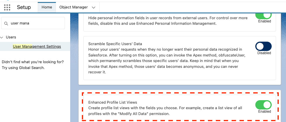 在“Setup”中,导航到“User Management Settings”部分,确保已启用增强的简档列表视图。