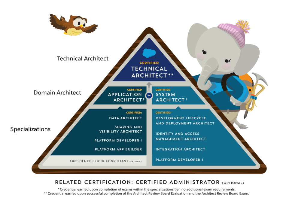 位于金字塔底部的是专业认证,专注于Salesforce平台的特定方面。这些认证使从业者具备处理Salesforce架构特定领域(例如数据或安全性)的知识和技能。