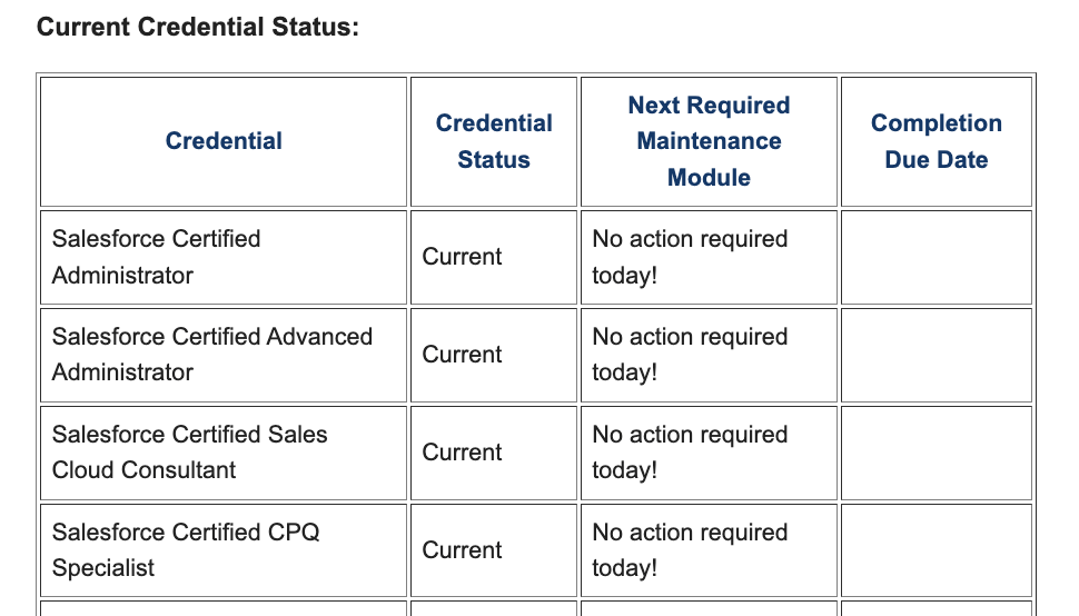 在获得Salesforce认证之后,除了要将其放在LinkedIn和Trailblazer.me个人资料中,还有一种官方途径可以让其他人确认你确实获得了这些认证,这也是你检查是否需要进行认证维护的一种方式。
