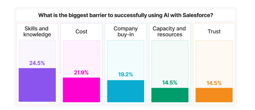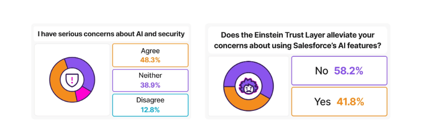 即便使用了AI工具,也往往浅尝辄止,真正能理解其工作原理、善用其潜力的少之又少。与此同时,41.8%的受访者表示,对Salesforce的AI安全机制——特别是Einstein Trust Layer——并不完全放心。
