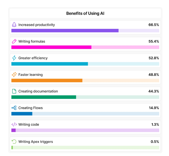 报告显示,71%的Salesforce管理员已经在工作中频繁或间歇性地使用AI工具,最主要的用途包括: