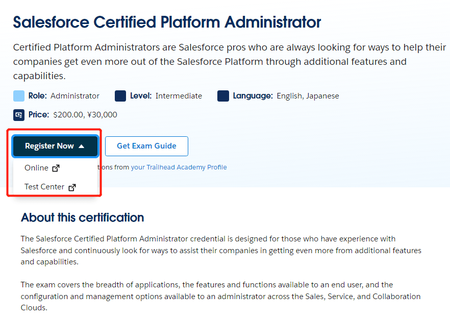 在证书页面点击 Register Now(立即注册),选择Test Center(线下考点)进入预约通道。