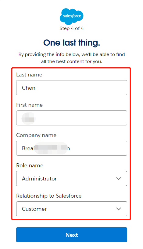 填写个人信息:姓、名、公司名称、角色、与 Salesforce 的关系