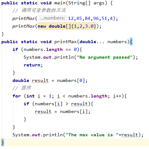 - 在方法声明中,在指定参数类型后面加上一个省略号(...)。
