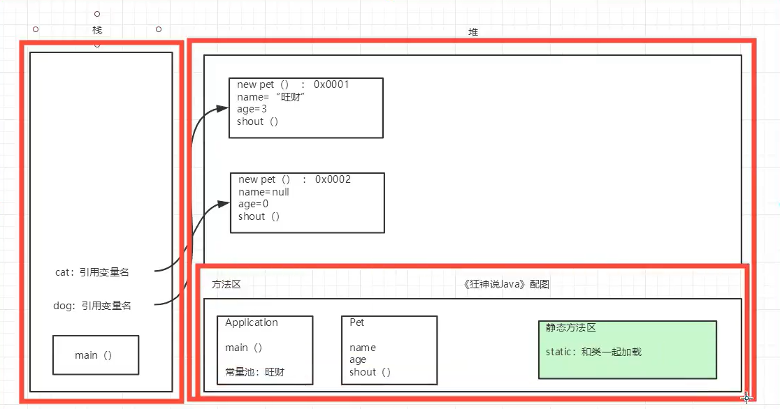 使用new关键字创建的时候,除了分配内存空间之外,还会给创建好的对象进行默认的初始化,以及对类中构造器的调用