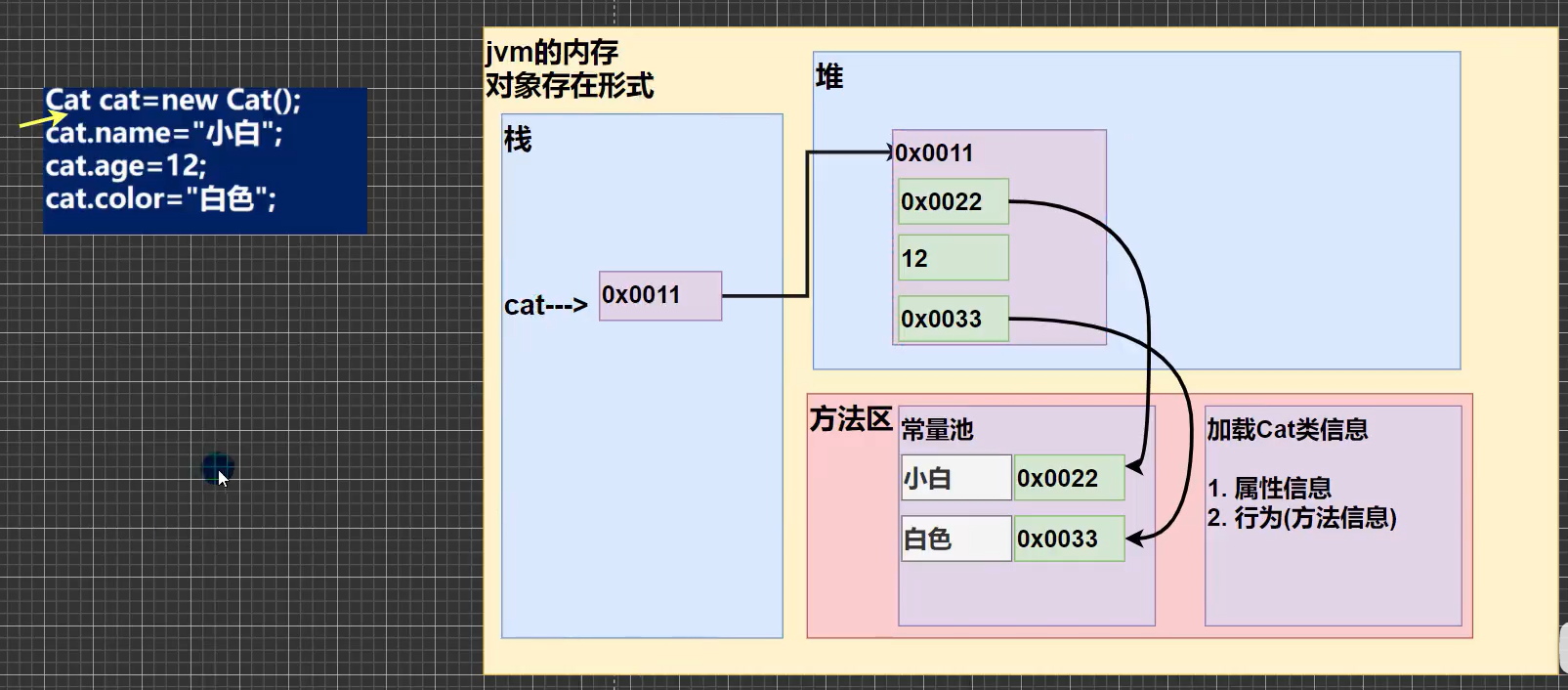 cat = new Cat(); // 栈:创建一个内存空间,将地址引用给cat——>[0x1122]