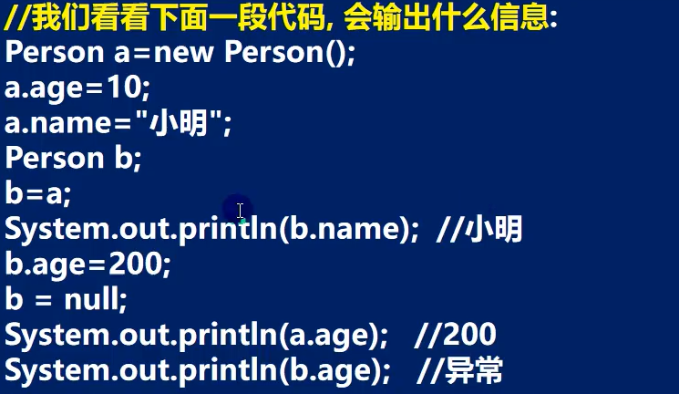 - 堆中开辟空间,地址,属性为默认值:age——>0,name——>null;new Person();