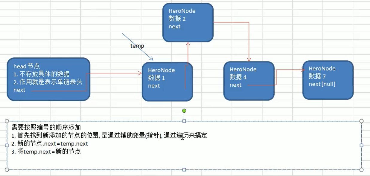 思路:先找到添加节点的位置,通过辅助变量(指针);新的节点next=temp.next;将temp.next=新的节点