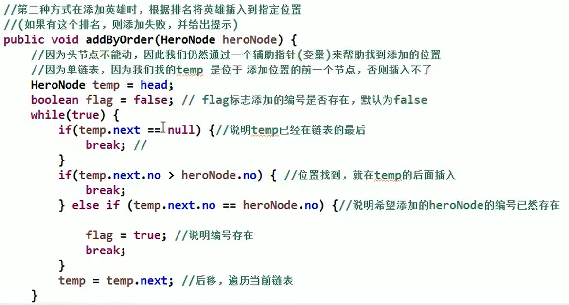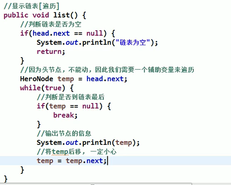 - (判断)temp.next==null,已到链表末尾,break