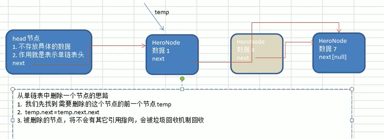 - temp.next.no与要删除节点的no进行比较,初始:temp=head