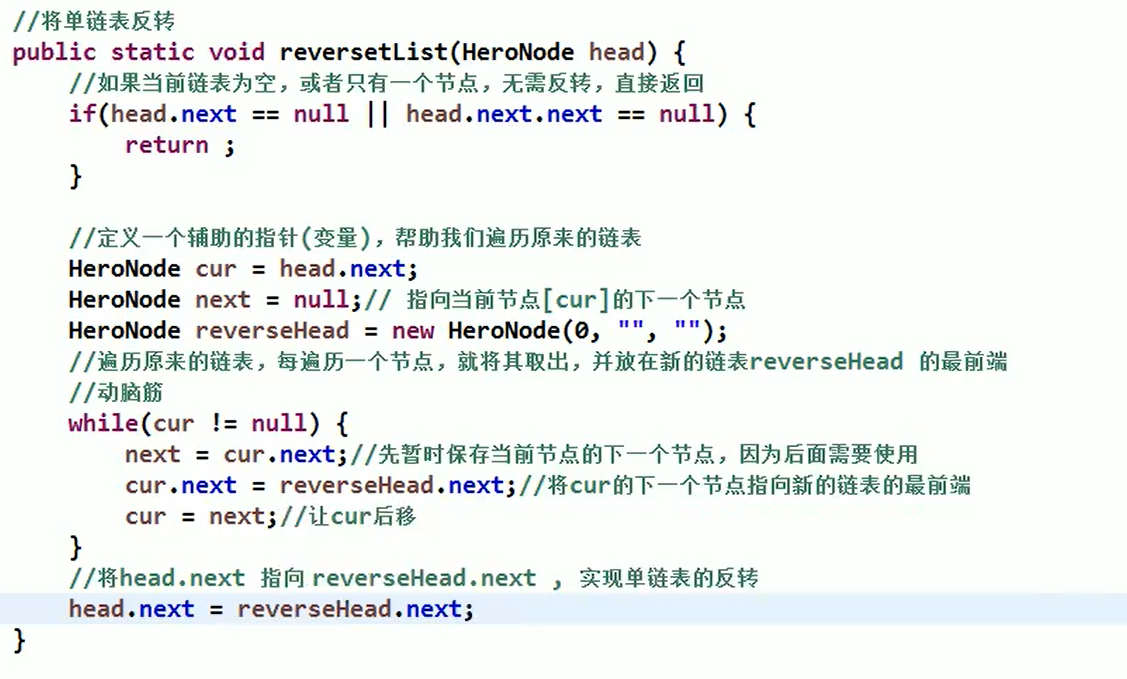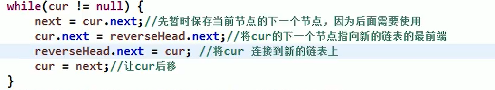 - 将原始链表从头开始遍历,每取出一个元素node,就将元素放于reverseLinkedList的第一个位置,即node.next=reverseHead.next,reverseHead.next=node (因为需要从初始链表取数据,所以需要一个额外的变量next指向当初始链表的下一个要取的元素)