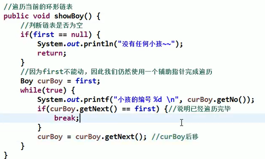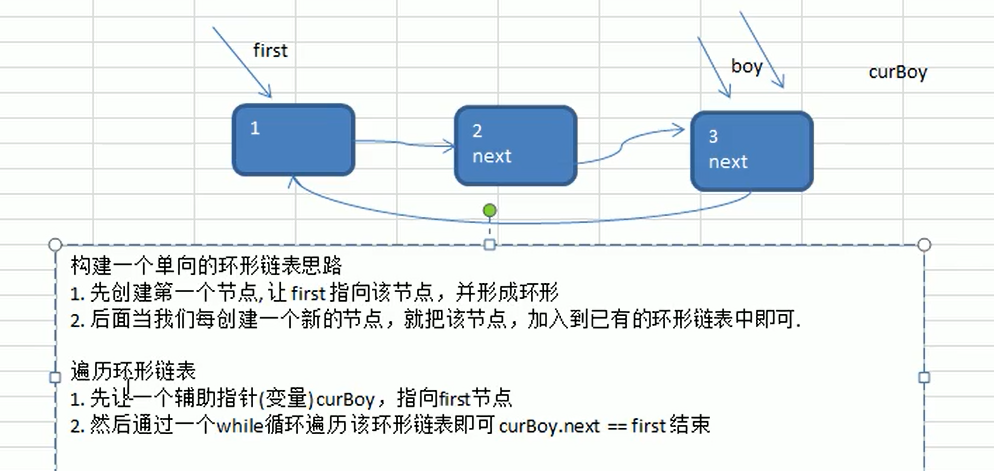 疑问:创建时为什仫需要两个辅助变量:一个curBoy指向当前节点,另一个boy指向要加入链表的节点curBoy.next=boy,boy.next=first,curBoy=boy,