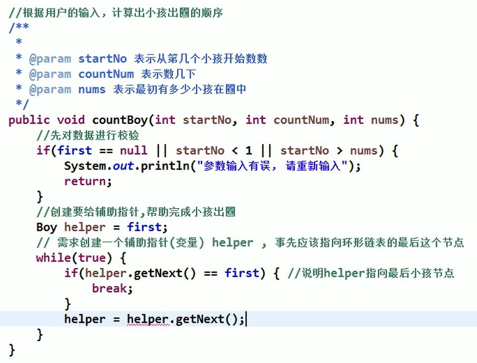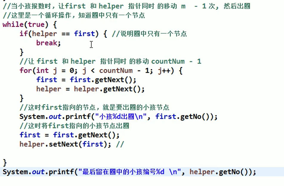 - 出圈前helper和first先移动k-1次,移动到报数小孩的位置(实现了helper后才做)