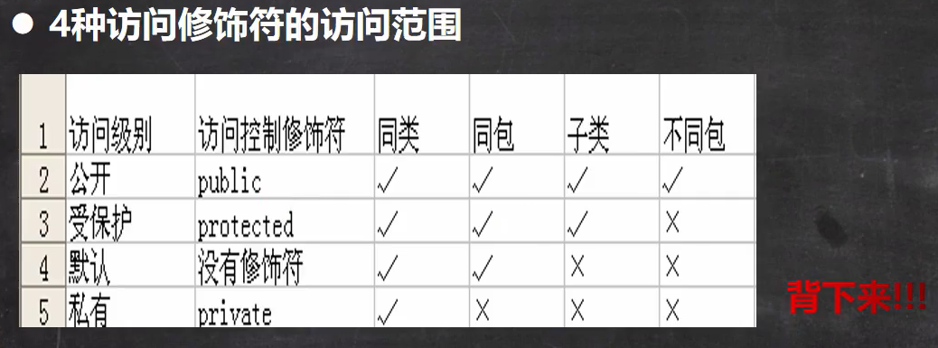 四种访问修饰符访问范围: