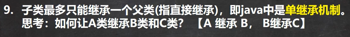 继承使用细节9:Java中是单继承机制:子类只能继承一个父类(指直接继承),中转继承