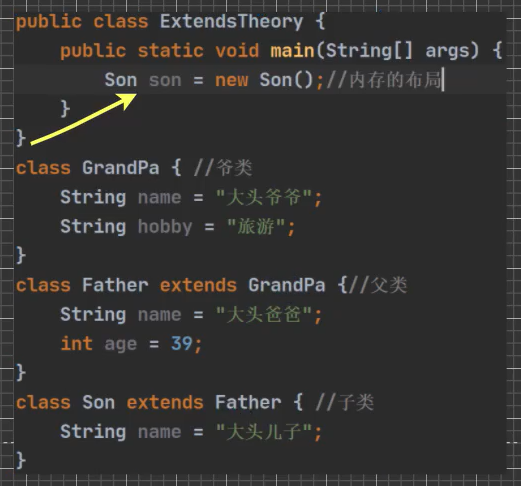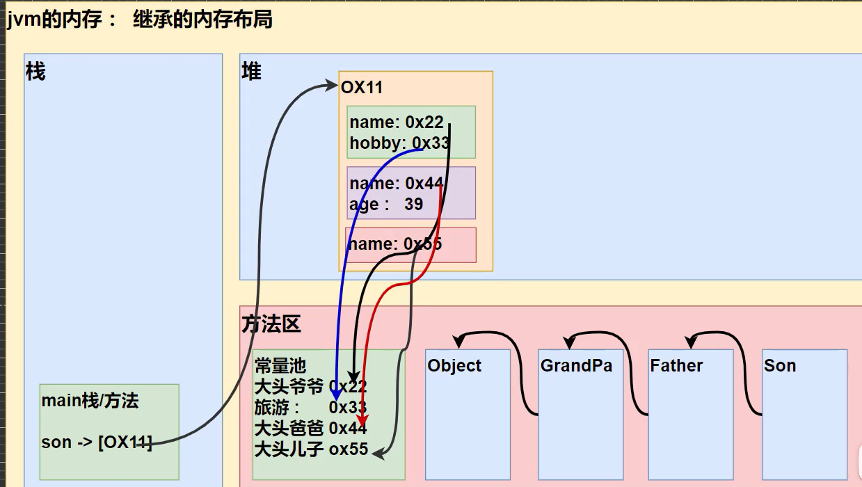 - new Son();时,最先加载顶级父类Object信息,然后逐级向下加载类信息,并建立继承关系