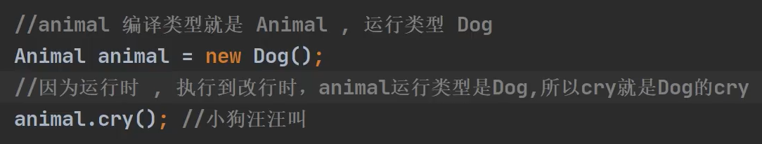 编译类型,运行类型的代码体现:父类引用指向子类对象,且运行时以运行类型为主